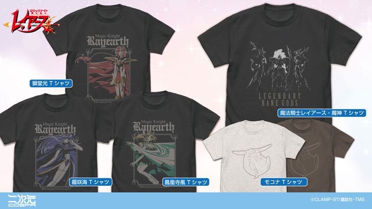 Tシャツは獅堂光、龍咲海、鳳凰寺風、モコナのほか、炎神レイアース・海神セレス・空神ウィンダムを描いた「魔法騎士レイアース・魔神」や「光・海・風の剣」の6種類を用意。スマホケースには強化ガラスが使用され、光、海、風がそれぞれデザインされた。アニメのオープニング「光と影を抱きしめたまま」に登場する光、海、風のワンシーンを切り取ったアクリルアートスタンドや、デフォルメされたキャラクターたちがつままれた「アクリルつままれ」などのアイテムも販売される。コスパほかでは予約を受付中。商品は2025年3月中旬から順次発送される。