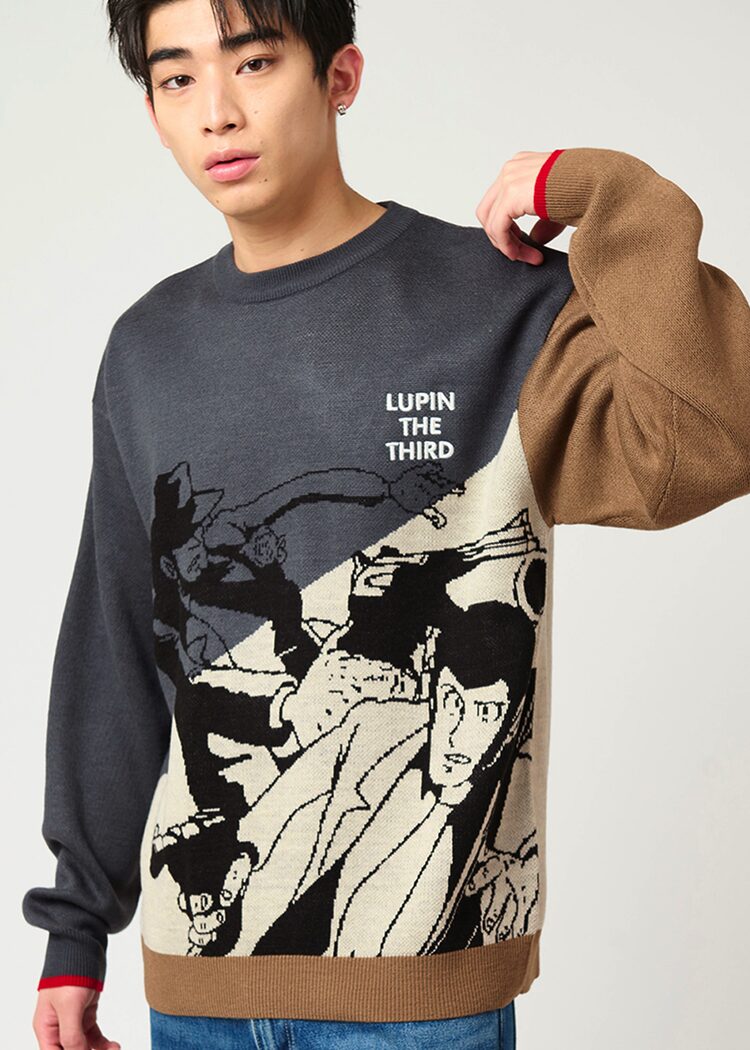 銭形警部のコートを思わせるブラウンカラーのベロアトラックスウェットのフロントには、銭形警部と見せかけて変装したルパンをデザイン。背面には顔を明かしたルパンが刺繍されている。ビッグシルエットスウェットにはルパン、次元、五ェ門に続いて疲れた様子の銭形警部の姿も。ニットには第26話「バラとピストル」に登場する、ルパンと次元がお互いを変装した偽物だと思いながら撃ち合う様子をジャカード編みで表現。トラックジャケット、トラックパンツ、リバーシブルMA-1にはオープニング映像のシーンをつなぎ合わせたパターンがデザインされている。また妖艶な姿の不二子を目を引くピンク色で表現した靴下、逃げるルパン一味がサーチライトで照らされている様子をイメージしたデザインの財布などもラインナップされている。