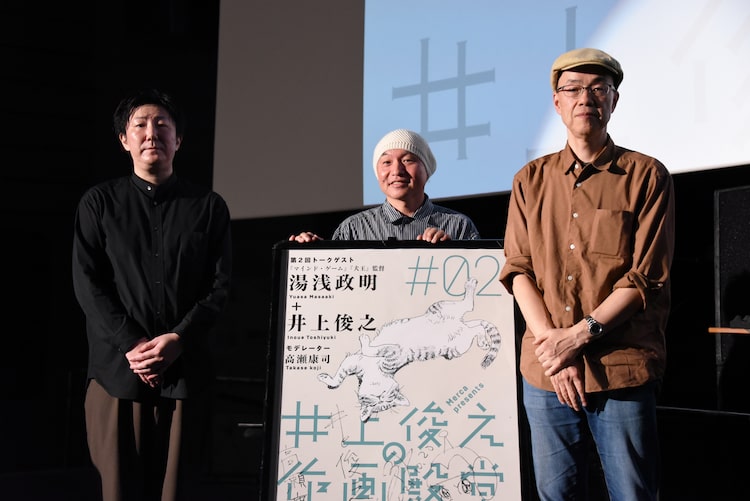 「井上俊之の作画殿堂」というイベントタイトルに合わせ、モデレーターの高瀬康司から「マインド・ゲーム」の作画について問われた井上は「カーチェイスのシーンが見どころ」であることに触れながら、「水の描写が特に印象的でした。型通りのアニメ的な表現にしたくないということがよく表れている」とコメント。またトーク中、湯浅が「(井上に作品制作を一緒に)やってほしいですけどね。ずっと誘ってはいるんですけど」と声をかけると、井上が「次回は参加したい」と口にし、観客から拍手が送られる一幕もあった。
