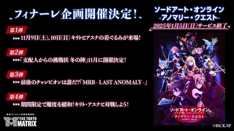 「ソードアート・オンライン -アノマリー・クエスト-」のサービス終了にあたり、キリト役の松岡禎丞、アスナ役の戸松遥、ユイ役の伊藤かな恵からはコメントが到着。なお「THE TOKYO MATRIX」の公式オンラインストア・THE TOKYO MATRIX ONLINE STOREは、2025年3月頃まで営業を行う。また「THE TOKYO MATRIX」は「ソードアート・オンライン -アノマリー・クエスト-」のサービス終了後、新しいコンセプトの施設として全面リニューアルされる。