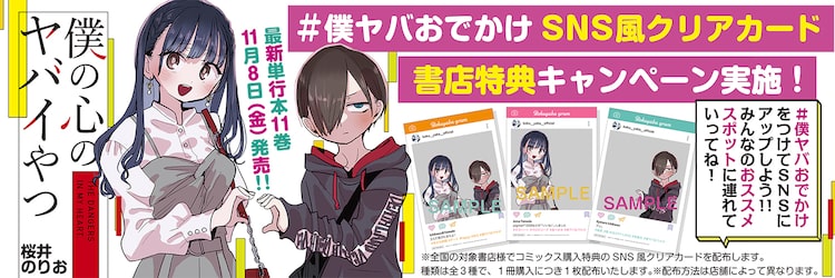 桜井のりお「僕の心のヤバイやつ」11巻が、本日11月8日に発売された。これを記念し、全国の対象書店では「SNS風クリアカード」がもらえるノベルティフェアが開催されている。