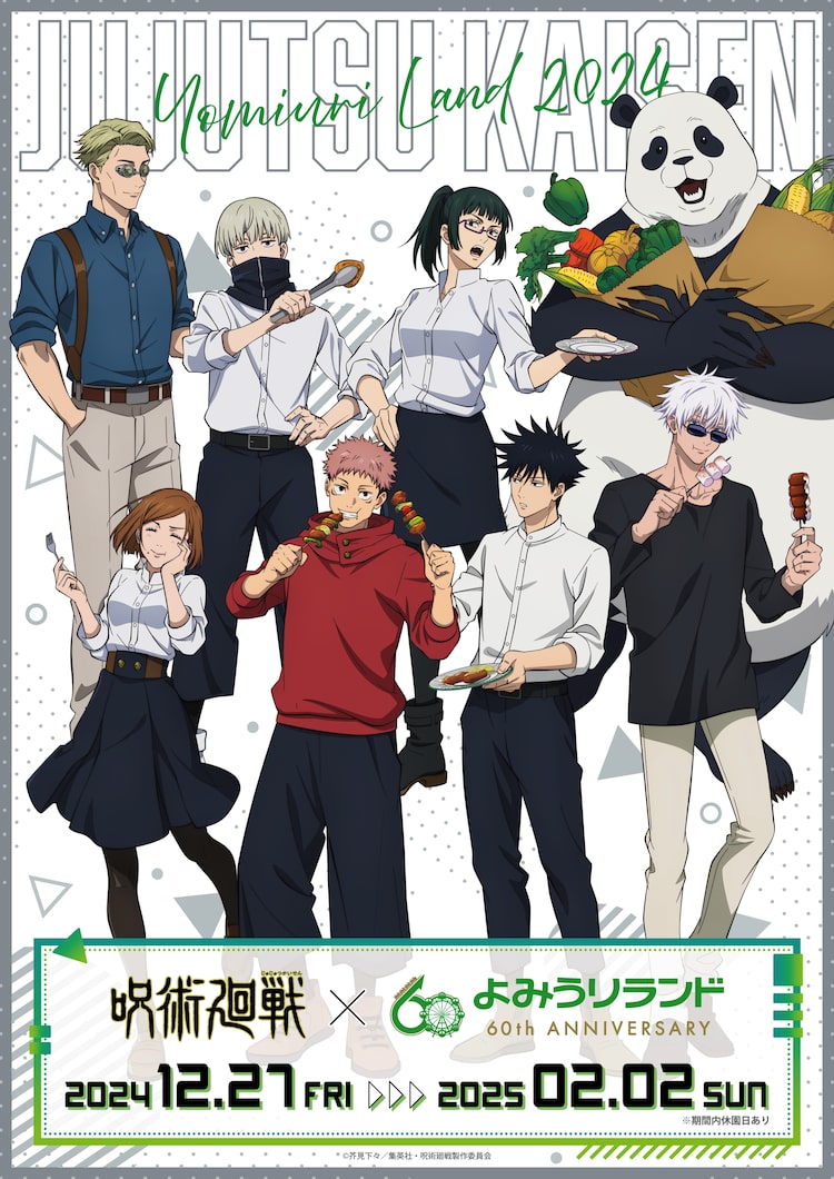 「呪術廻戦」とよみうりランドのコラボは今回で3回目。コラボイベント「TVアニメ『呪術廻戦』×よみうりランド2024」のビジュアルには、よみうりランド内のバーベキューパーク・JU-JUでバーベキューを楽しむ虎杖悠仁ら8キャラクターの姿が描き下ろされた。イベント期間中はJU-JUにてコラボBBQセットを販売。また園内ではイラストを使用したグッズやコラボフードも販売予定だ。さらにアトラクションとのコラボやフォトスポットも楽しめる。詳細は続報を待とう。