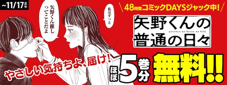 アプリジャックでは、コミックDAYSに掲出されているバナーすべてが「矢野くんの普通の日々」の名シーンに。また「矢野くんの普通の日々」のほぼ5巻分にあたる37話までを無料で読むこともできる。期間は本日11月15日から17日11時59分まで。