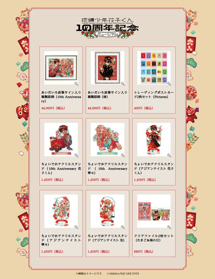 2025年1月の東京会場を皮切りに、大阪、愛知、福岡を巡回する「地縛少年花子くん10周年記念ミュージアム」。グッズ第1弾としてあいだいろの直筆サイン入り複製原画や、イベントビジュアルの和装姿の花子くんたちが描かれた「ちょいでかアクリルスタンド」、もっけを模した「もっけ きんちゃく」などがラインナップされている。