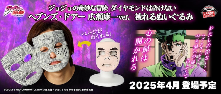 荒木飛呂彦原作によるTVアニメ「ジョジョの奇妙な冒険 ダイヤモンドは砕けない」より、岸辺露伴の能力であるヘブンズ・ドアーを受け、本に変えられた広瀬康一の顔を再現したぬいぐるみが登場。2025年4月よりアミューズメント専用景品として展開される。