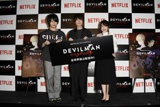 Netflixオリジナルアニメ「DEVILMAN crybaby」の全世界配信記念トークイベントが、1月19日に東京・新宿バルト9にて開催され、不動明役の内山昂輝、飛鳥了役の村瀬歩、牧村美樹役の潘めぐみが出席した。