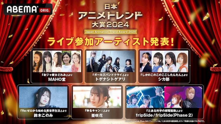 出演アーティストにラインナップされたのは、「しかのこのこのここしたんたん」よりシカ部、「ガールズバンドクライ」より劇中ガールズバンド・トゲナシトゲアリ、「Re:ゼロから始まる異世界生活」よりオープニングテーマを担当してきた鈴木このみ、「ゆるキャン△」より主題歌を担当してきた亜咲花。さらに今年放送25周年を迎えた「おジャ魔女どれみ」よりMAHO堂が出演し、それぞれ一夜限りのライブを披露する。