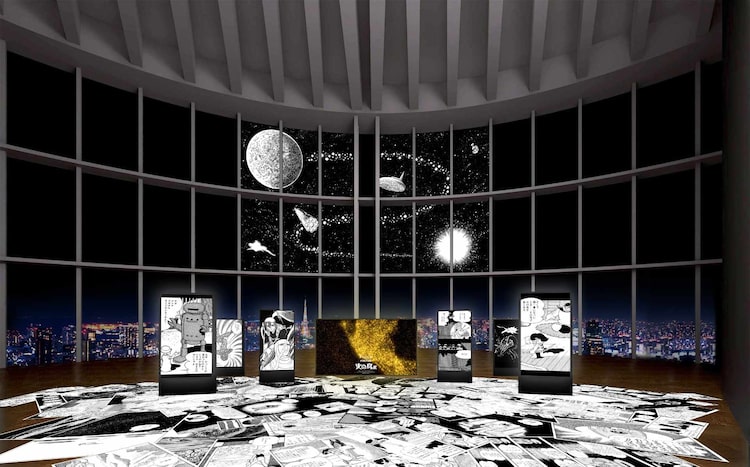 展覧会は全4章で構成。「火の鳥」の主要12篇にまつわる800点以上の原画や関連資料が展示される。“プロローグ”となるエントランスでは、窓枠、床面、大型モニターを駆使し、「火の鳥」の世界観をダイナミックに展開。中央モニターにはデザイナー・中村勇吾が手がけた映像が映し出され、展覧会の企画・監修を務めた生物学者の福岡伸一氏が唱える「動的平衡」のイメージに重ねて、火の鳥が飛翔する様子が描かれる。左右に配置された6基のモニターには「黎明編」から「太陽編」までの12篇の中から、中村が厳選したシーンがランダムに表示される。