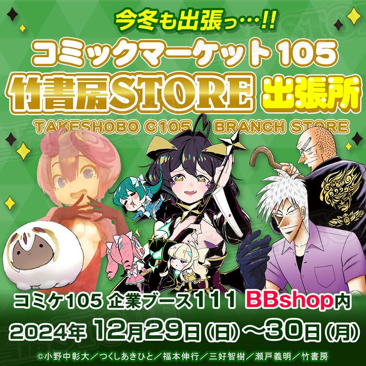「BBshop内『C105竹書房STORE出張所』」では、購入特典のミニクロスも用意。税込5000円ごとにランダムで1枚配布される。竹書房STOREの公式Xアカウントでは、グッズが当たるプレゼント企画も開催。詳細は公式サイトの告知で確認を。通販サイトの竹書房STOREでは事後通販を行う。事後通販ではセット商品が単品販売される予定だが、会場で完売の可能性もあるため注意しよう。