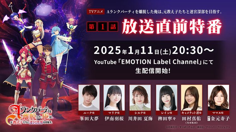 TVアニメ「Aランクパーティを離脱した俺は、元教え子たちと迷宮深部を目指す。」の番組「『エパリダ』第1話放送直前特番」が、2025年1月11日20時30分よりYouTubeのEMOTION Label Channelで配信決定。またアニメのノンクレジットオープニング映像、エンディング映像がYouTubeで公開された。