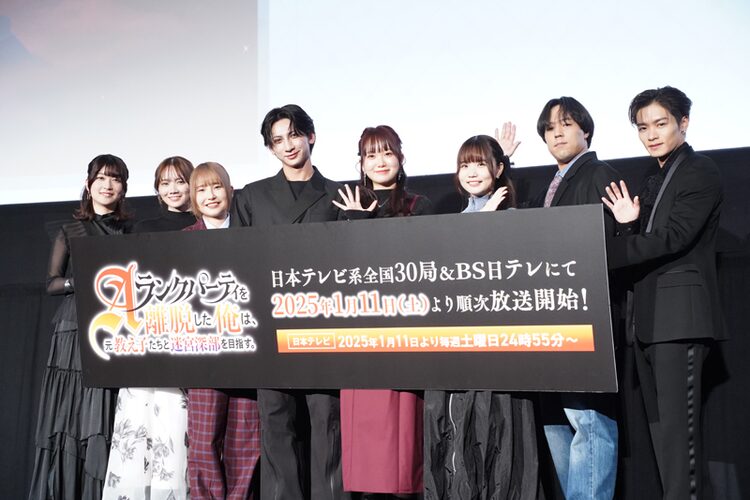 TVアニメ「Aランクパーティを離脱した俺は、元教え子たちと迷宮深部を目指す。」の先行上映会が、本日12月17日に東京・新宿ピカデリーで開催された。上映後にはキャストによるトークショーを実施。ユーク役の峯田大夢、マリナ役の伊南羽桜、シルク役の川井田夏海、レイン役の稗田寧々、バリー役の世界(EXILE/FANTASTICS)、キャメラット君役の田村真佑(乃木坂46)、オープニング主題歌担当の零、エンディング主題歌担当の田中有紀が登壇した。