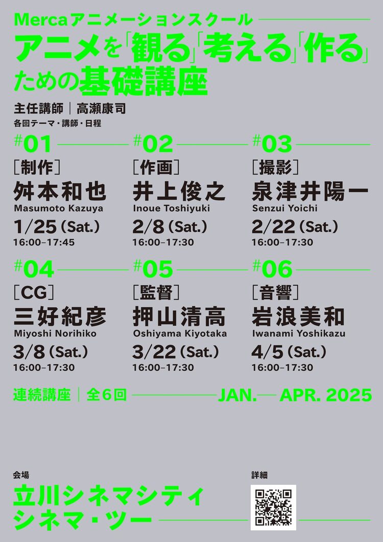 アニメをより楽しむために学ぶ全6回の講座「Merca アニメーションスクール──アニメを『観る』『考える』『作る』ための基礎講座」が、2025年1月25日より隔週土曜に東京・立川シネマシティのシネマ・ツーで開催される。