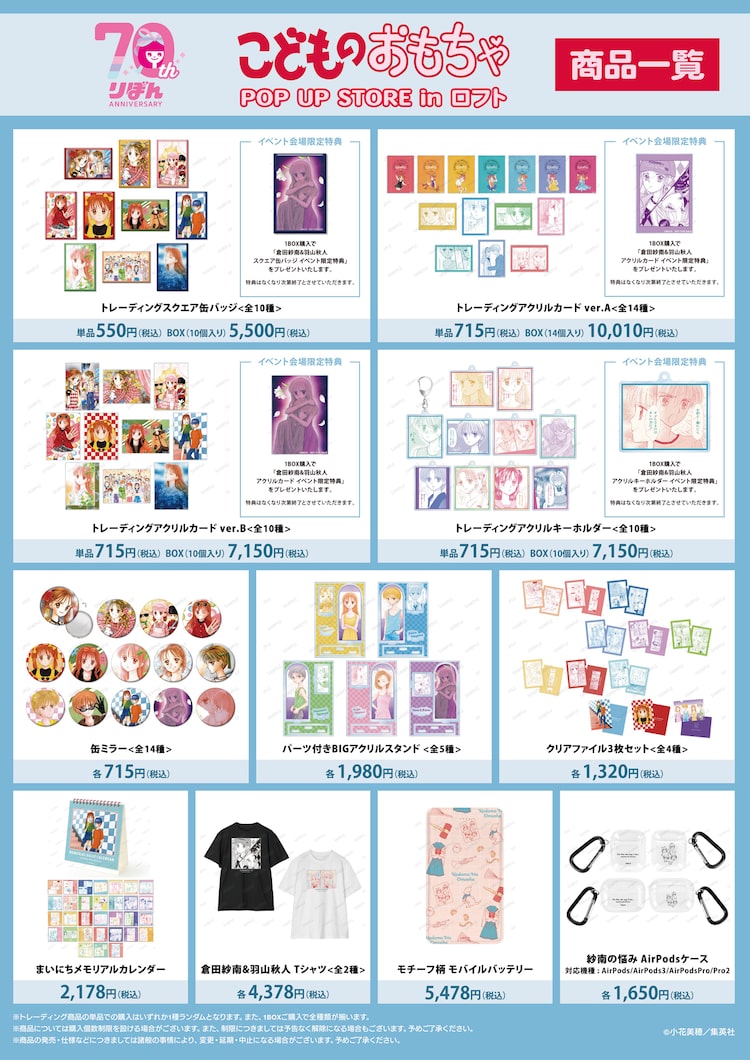 ポップアップストアではカラーイラストやマンガのコマを使った新商品の先行販売を実施。缶バッジやアクリルキーホルダー、缶ミラーやカレンダーなどが並ぶ。作中で紗南が書いた四角関係の図をあしらった「紗南の悩み AirPodsケース」といったアイテムも。会場限定の購入特典やトレーディングアイテムのボックス購入特典も用意されている。なお商品は後日ECサイト・AMNIBUSでも予約販売予定だ。