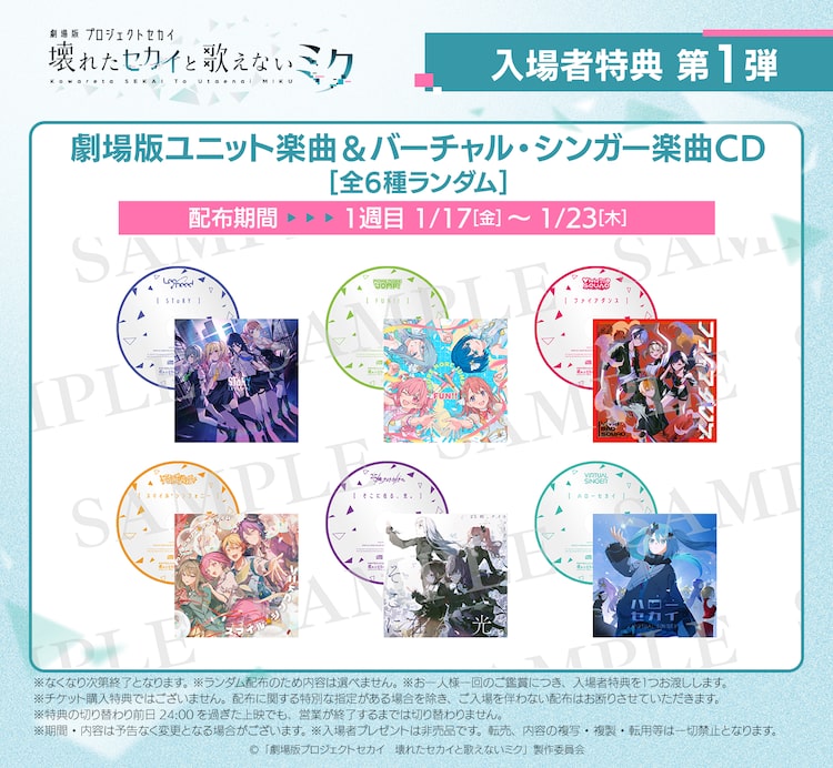 書き下ろし楽曲のCD全6種類から、ランダムで1枚が手に入る入場者プレゼント第1弾。ジャケットは6人のイラストレーターによる描き下ろしで、Leo/needの「SToRY」はドルストイ、MORE MORE JUMP!の「FUN!!」はあかもく、Vivid BAD SQUAD「ファイアダンス」は問七、ワンダーランズ×ショウタイムの「スマイル*シンフォニー」はみっ君、25時、ナイトコードで。の「そこに在る、光。」はカラスロ、バーチャル・シンガーの「ハローセカイ」はおむたつが手がけた。なお「ハローセカイ」は劇場版とは異なり、バーチャルシンガー6人が歌唱したスペシャルバージョンが収録されている。入場者プレゼント第1弾には、1月26日までの期間限定で楽曲を試聴できるコードや、アプリゲーム「プロジェクトセカイ カラフルステージ! feat. 初音ミク」で交換できるシリアルコードも付属する。