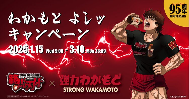 板垣恵介原作によるアニメ「範馬刃牙」と、胃腸薬「強力わかもと」などを販売するわかもと製薬がコラボレート。コラボグッズなどが当たる「わかもと よしッ キャンペーン」が本日1月15日から3月10日まで開催される。