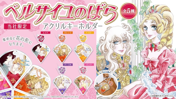 カプセルトイの内容は、薔薇をモチーフにしたアクリルクーホルダー全5種。花びらのような形をした1つひとつに、オスカル、アンドレ、マリー・アントワネット、フェルゼンの原作イラストがデザインされている。すべて集めて組み合わせると花の形が完成。中央にも5色の薔薇ができあがる。価格は1回税込398円。かぷえぼの設置店舗については、カプセルトイ専門店・TOYS SPOT PALOの公式サイトで確認を。