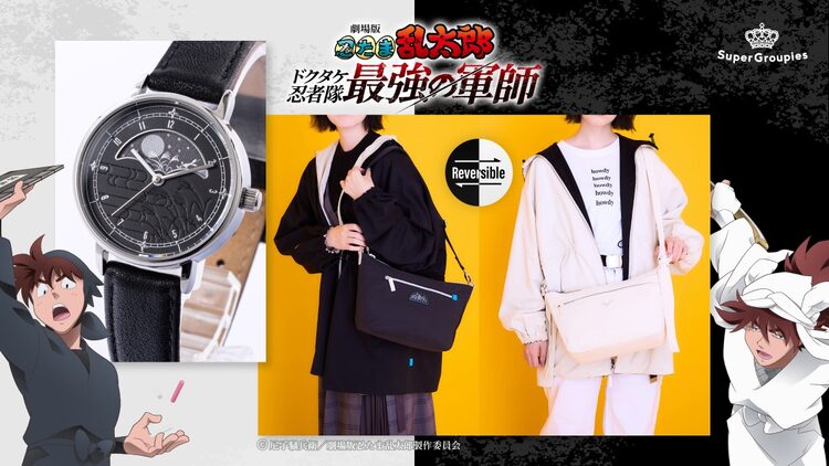登場したのはボディバッグ、マウンテンパーカー、腕時計の3アイテム。ボディバッグとマウンテンパーカーはリバーシブルで、表裏一体な土井先生と天鬼が表現されている。腕時計は黒を基調としており、盤面には漂う雲や揺れるススキをデザイン。インデックスには手裏剣や、一年は組をイメージしたカラーがアクセントとして置かれている。ムーンフェイズには、土井先生ときり丸が暮らす長屋の情景が盛り込まれた。