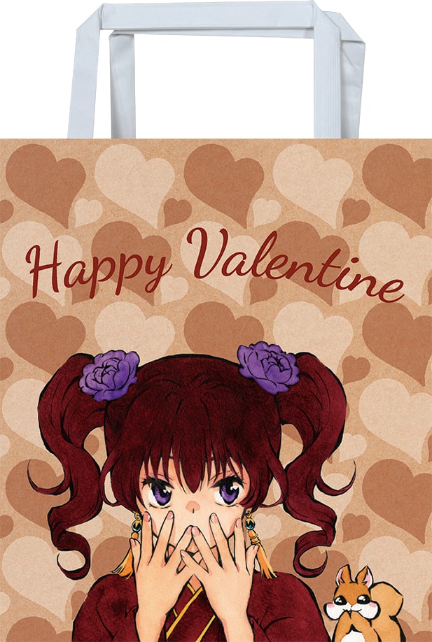 バレンタインバッグは、草凪描き下ろしのヨナとハクのイラストがデザインされた紙袋。全面にハートマークがあしらわれており、サイズはマチ付きで横180mm、縦210mmで制作された。
