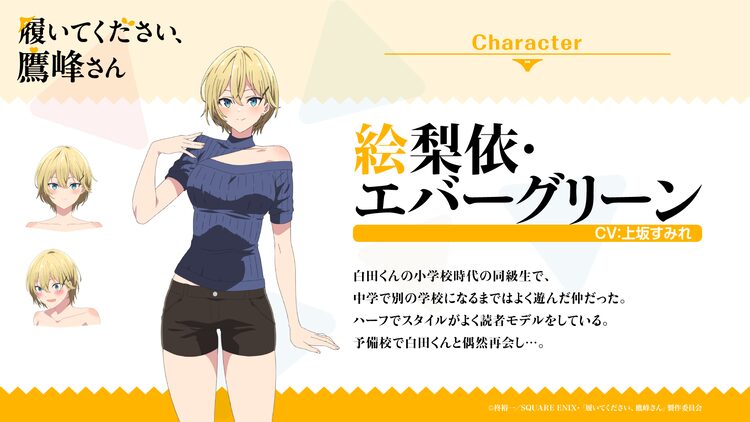 絵梨依・エバーグリーン役を演じさせていただきますっ!エリィちゃんはスタイル抜群で遊びも勉強も全力な美人さんです!鷹峰さんのことになるとちょっと様子がおかしくなっちゃったり…?! 表情豊かで、演じていてとても楽しいキャラクターでした!毎話ドキドキなシチュエーション&妄想を思いきり堪能できる作品ですっ!