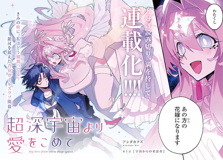 アシダカヲズの新連載「超深宇宙より愛をこめて」が、発売中のコミック百合姫4月号(一迅社)でスタートした。