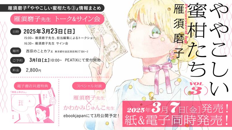 最新3巻が3月7日に発売される「ややこしい蜜柑たち」は、親友の初夏に執着して、彼氏を寝取ってしまった陰気な美人・清見を取り巻くラブストーリー。フィール・ヤング(祥伝社)で連載されている。トーク&サイン会では、15時から雁と担当編集によるトーク、16時半からサイン会を実施。3月1日10時より、PEATIXで予約を受け付ける。