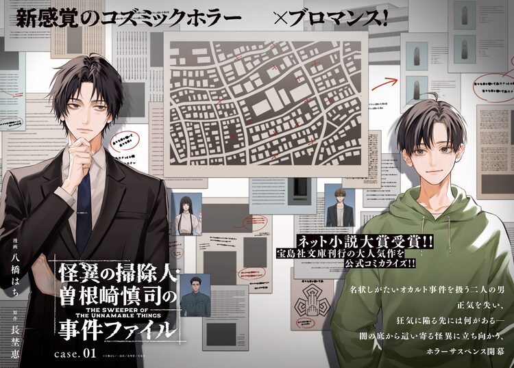 「怪異の掃除人・曽根崎慎司の事件ファイル」は、長埜による同名小説のコミカライズ。オカルト専門のフリーライター・曽根崎慎司(そねざきしんんじ)は、怪異の事件を解決する“怪異の掃除人”を本業としていた。彼が追っているのは、DNAが一致する複数の切断された指の謎。町で立て続けに発見された指の真実に迫るべく、曽根崎は大学生の竹田景清(たけだかげきよ)を連れて調査に赴く。そこで2人は怪異を目にし、さらにそれがある場所へと近づいていることに気づき……。闇の底から這い寄る怪異に立ち向かう、コズミックホラーサスペンスだ。