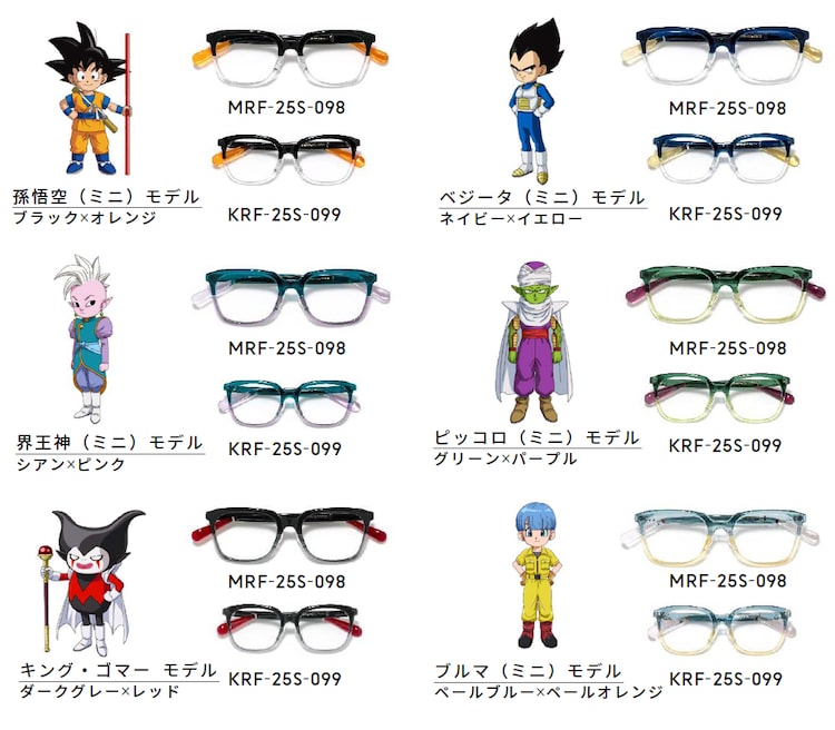 「ドラゴンボールDAIMA モデル」は大人向け1型6種、子ども向け1型6種の全12種。いずれもウェリントン型で、フロント上部のデザインが太くしっかりとしたサーモントブロータイプのフレームだ。「孫悟空(ミニ)モデル」はオレンジと黒、「ベジータ(ミニ)」モデル」はネイビーとイエローの組み合わせで、カラーリングでそれぞれのキャラクターが表現されている。
