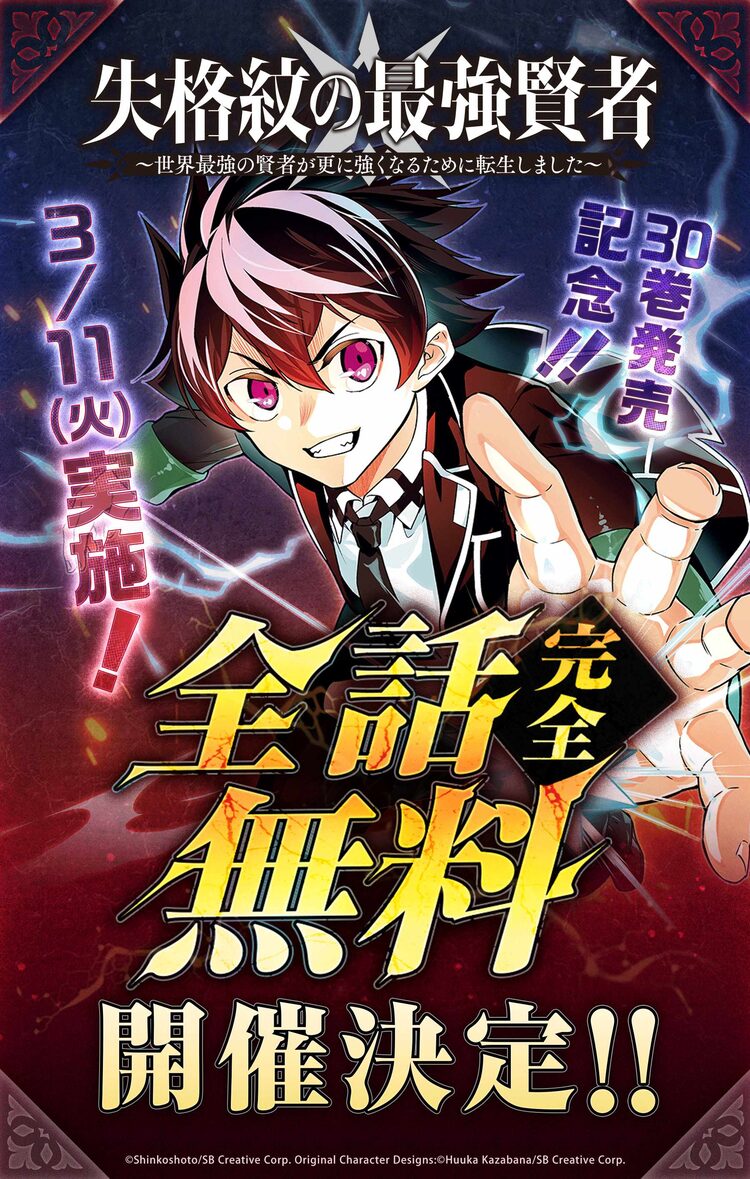 進行諸島原作による肝匠&馮昊「失格紋の最強賢者 ~世界最強の賢者が更に強くなるために転生しました~」の全話無料公開が、明日3月11日にマンガUP!およびガンガンONLINEで実施される。