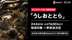 中学生の少年・うしおと、500年ぶりに解放された大妖怪・とらのコンビが繰り広げる冒険とバトルを描いた「うしおととら」。テレビアニメは2015年7月より3クールにわたり、全39話がオンエアされた。一挙放送はアニメ化3周年を記念し実施されるもので、毎週日曜19時30分より5話ずつ配信。放送後48時間以内は、Abemaビデオでも視聴できる。