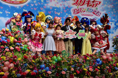 続いて「映画プリキュアスーパースターズ!」に出演する北村一輝と小野賢章が、「魔法つかいプリキュア!」「キラキラ☆プリキュアアラモード」「HUGっと!プリキュア」のプリキュア12名に連れられてステージに。北村はプリキュアの着ぐるみを見ながら「みんなかわいいですよね。目を見てくるので、ドキドキしてしまって。いちいちキュンキュンする……たまんないですよね」と、プリキュアたちの魅力にノックアウトされた様子。小野も「そうなんです。ステージの裏で、(観客は)誰もいないのに目を合わせて目を見てくる。どこを見ていいかわからないくらい華やかで、目が泳いじゃいます」とタジタジだったことを明かした。