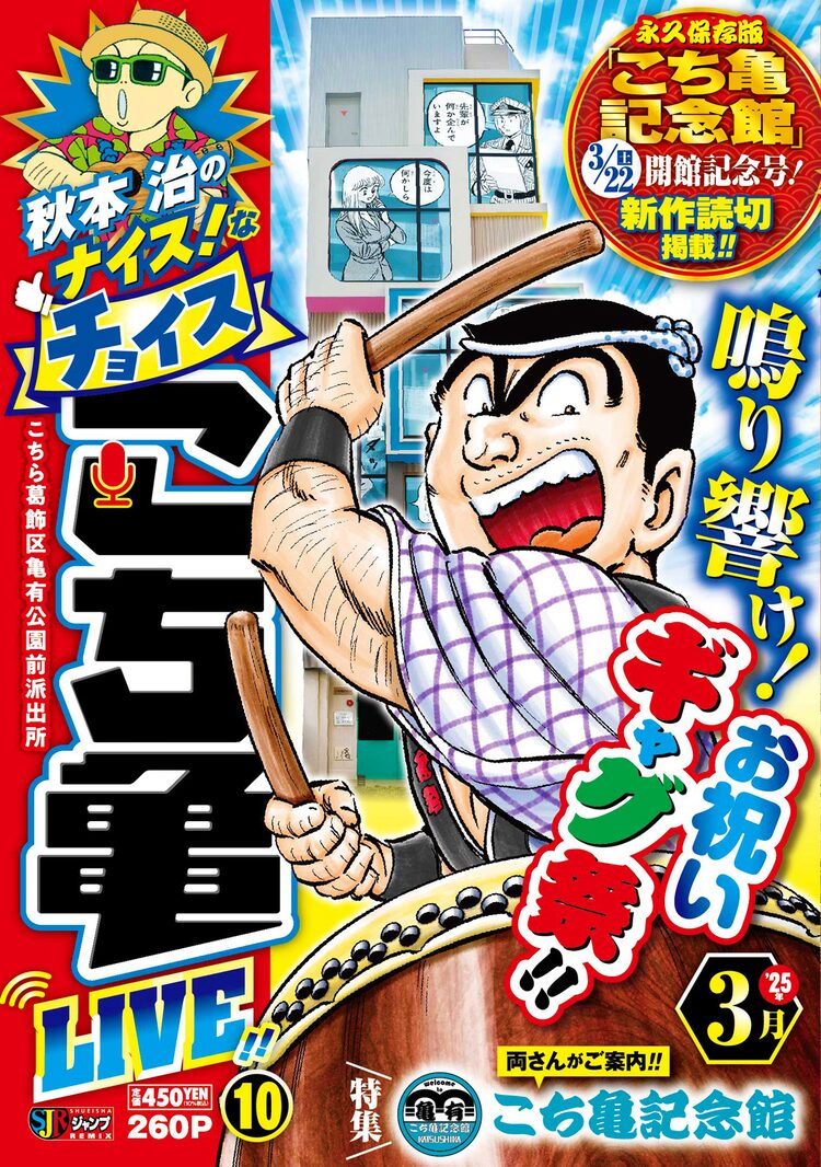 この読み切りは「こちら葛飾区亀有公園前派出所」の観光施設・こち亀記念館が、3月22日に東京都葛飾区亀有に開館したことを記念したもの。なお集英社ジャンプリミックスから3月21日に発売された“再編集版コミックス”「秋本治のナイス!なチョイス こち亀 LIVE!! 10 ’25年3月」は、「こち亀記念館」開館記念号となっており、こちらにも5ページの新作読み切りが収録されている。