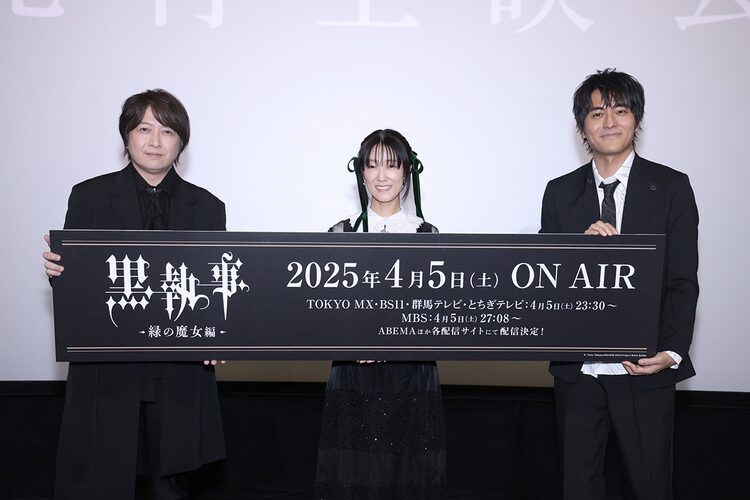 枢やな原作によるTVアニメ「黒執事 -緑の魔女編-」第1、2話の先行上映会が、去る3月23日に東京のユナイテッド・シネマアクアシティお台場で開催され、バスチャン・ミカエリス役の小野大輔、ジークリンデ・サリヴァン役の釘宮理恵、ヴォルフラム役の小林親弘が登壇した。