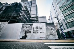 解体中の秋田書店本社屋の工事現場の仮囲いに、板垣恵介「刃牙」シリーズの名場面である“史上最強の親子喧嘩”をモチーフにしたグラフィックがデザインされた。