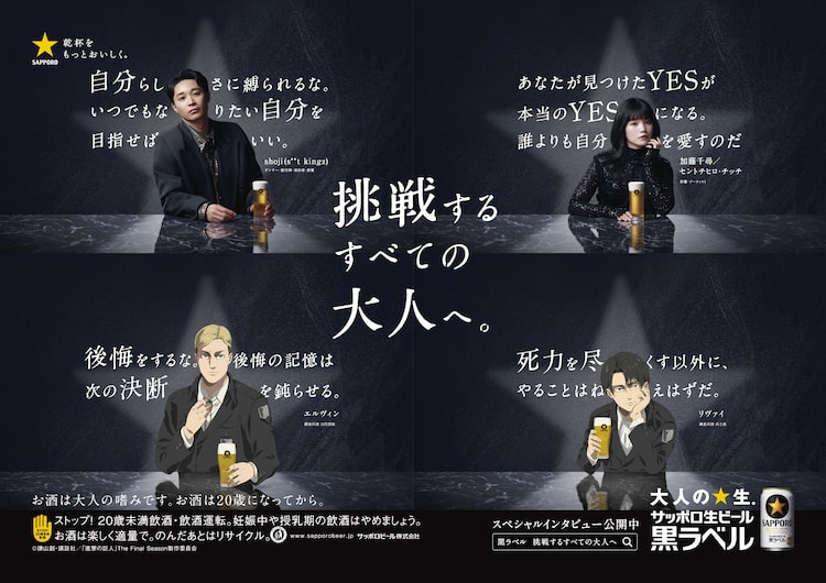 「挑戦するすべての大人へ。」は、自身がこれまで“挑戦”した経験を振り返りながら、この春に転機を迎える人に伝えたい思いやメッセージを綴る企画。エルヴィンは「後悔をするな。後悔の記憶は次の決断を鈍らせる。」、リヴァイは「死力を尽くす以外に、やることはねえはずだ。」と、片手にビールを持ちながらメッセージを送っている。また企画にはs**t kingzのshoji、セントチヒロ・チッチこと加藤千尋も参加しており、それぞれメッセージが綴られた。メッセージは全国の主要駅を中心に駅構内の広告展開も行われる。