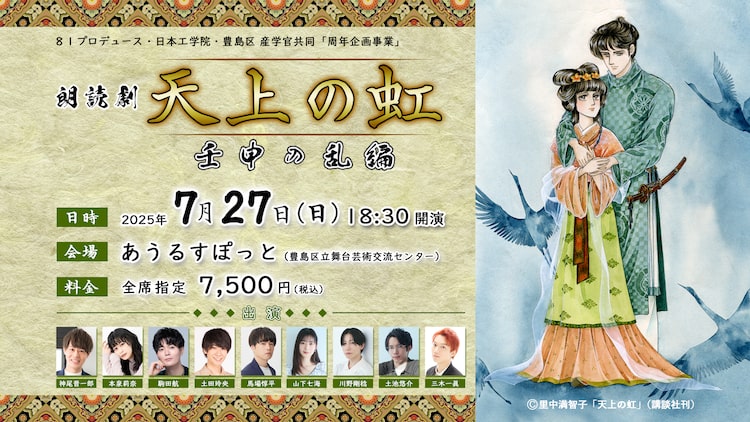 「天上の虹」は後に持統天皇となる鵜野讃良皇女の波乱万丈な人生を描く歴史ロマン。朗読劇は81プロデュースの声優陣が出演し、3部作で上演される。第1弾となる朗読劇「朗読劇『天上の虹』壬申の乱編」のテーマは、古代日本最大の内乱である「壬申の乱」。大海人皇子と鵜野讃良皇女、そして皇子たちの愛と苦悩と葛藤を描く。