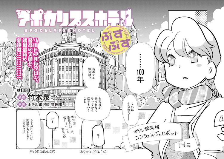 「アポカリプスホテル」の舞台は、銀座にあるホテル・銀河楼。人類が地球を離れて長い年月が経ちながらも、オーナーの帰還とお客様の来訪を待ち続ける、ホテリエロボットのヤチヨの奮闘を描く。「アポカリプスホテルぷすぷす」の第1話では、最後にお客様を迎えてから100年が経ったことを憂うヤチヨが、ホテル営業についてあるアイデアを思いつく。