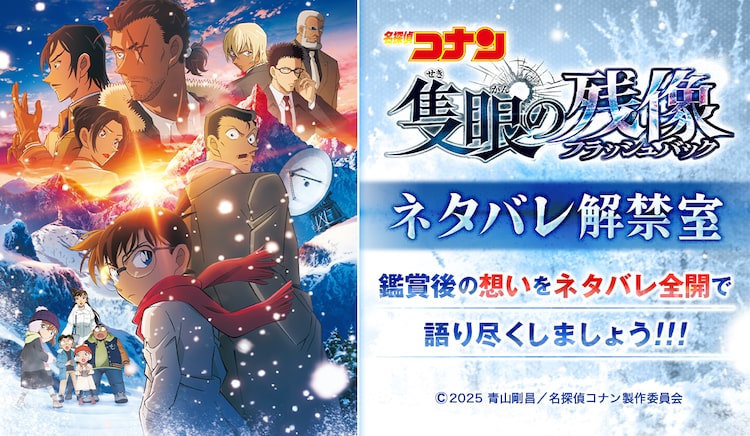 「ネタバレ解禁室」は、劇場版「名探偵コナン」の公開日に合わせて毎年展開されているもの。映画鑑賞後の感想や考察をネタバレありで自由に投稿できる“コメント専用エリア”として、今年もサンデーうぇぶりのアプリ内に期間限定で登場した。アプリ内では「名探偵コナン 隻眼の残像」の場面カットも公開。またコメント欄の「1コメ」には原作者の青山剛昌からファンに向けたメッセージも掲載されている。公開期間は7月31日まで。