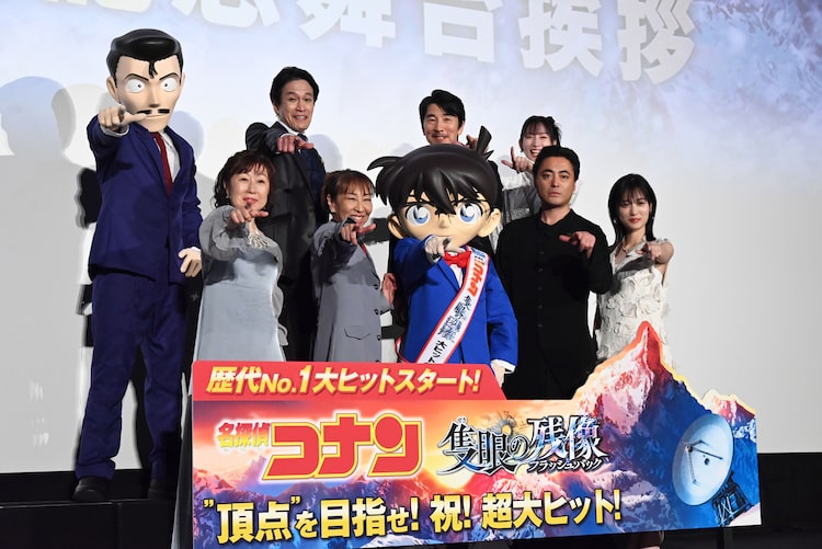 青山剛昌原作による劇場版「名探偵コナン 隻眼の残像(せきがんのフラッシュバック)」の公開記念舞台挨拶が、本日4月19日に東京・TOHOシネマズ日比谷で開催され、江戸川コナン役の高山みなみ、毛利蘭役の山崎和佳奈、毛利小五郎役の小山力也、大和敢助役の高田裕司、上原由衣役の小清水亜美、大友隆役の山田孝之、円井まどか役の山下美月が登壇した。