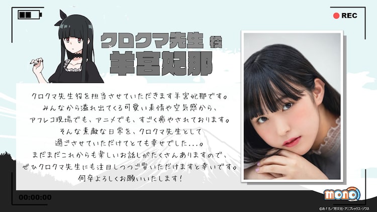 「mono」は、写真部と映像研究部が合体した“シネフォト部”に所属する女子高生たちの日常を描く作品。TOKYO MXほかで放送中で、本日放送された第5話でクロクマ先生が初登場した。羊宮からは「みんなから溢れ出てくる可愛い表情や空気感から、アフレコ現場でも、アニメでも、すごく癒やされております。そんな素敵な日常を、クロクマ先生として過ごさせていただけてとても幸せでした…」とコメントが到着。全文は下に記載した。また公式サイトでは、クロクマ先生の次回作のヒントになりそうな“奇妙な小話”を募集。選ばれたエピソードは後日クロクマ先生によって発表される。