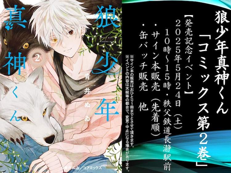 青井ぬゐ「狼少年真神くん」2巻が、本日5月20日に発売された。5月24日には、作品の舞台になっている埼玉・長瀞の、秩父鉄道長瀞駅前で発売記念イベントが開催される。
