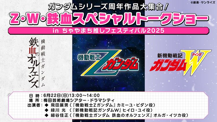 このトークショーは6月21日・22日に梅田の茶屋町一帯で開催される「ちゃやまち推しフェスティバル2025」の一環として行われるもの。「ガンダムシリーズ周年作品大集合!Z・W・鉄血スペシャルトークショー in ちゃやまち推しフェスティバル2025」と題され、今年40周年を迎える「機動戦士Zガンダム」からカミーユ・ビダン役の飛田展男、30周年を迎える「新機動戦記ガンダムW」からヒイロ・ユイ役の緑川光、10周年を迎える「機動戦士ガンダム 鉄血のオルフェンズ」からオルガ・イツカ役の細谷佳正が出演する。観覧は無料だが、事前の抽選申込が必要。抽選申込は本日5月23日18時から6月3日まで受け付け、 6月10日に当選発表が行われる。