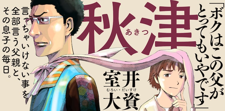 「秋津」はマンガ家の秋津薫と、その息子・いらかの日々を描くコメディ。秋津は長いキャリアで培った世渡りのスキルを駆使し、編集者やアシスタントを相手に全力で自分のわがままを通すなど、周囲の人間を巻き込んで迷惑な行動を起こし続ける。そんなダメ人間の父を心底嫌がるいらかとの、独特な親子関係が描かれる。単行本は全2巻が発売中。