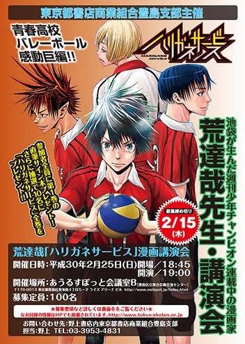 講演会では、荒がマンガ家になるまでの過程や、「ハリガネサービス」の制作秘話などが話されるほか、参加者からの質問も受け付ける。会場には複製原画が展示され、来場者には全員に荒の直筆サイン入り「ハリガネサービス」1巻を配布するほか、抽選で10名に2巻以降の全巻もプレゼントされる。参加は抽選制で、募集人数は100名。2月15日までハガキとメールにて応募を受け付けている。詳細は講演会を主催する東京都書店商業組合のサイトで確認を。