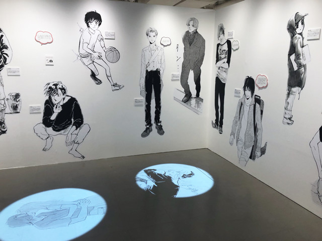 最後には選りすぐりのくらもち男子、いくえみ男子と記念撮影できるフォトスポットコーナーも。そこでは彼らのキュンとする名シーンがフロアに投影されるという演出も繰り広げられている。また物販コーナーでは、単行本の表紙をデザインしたマスキングテープやモバイルバッテリー、ポストカード、ポスター、マグカップなどの豊富なオリジナルグッズ、さらに2人の自画像や男子キャラクターのイラストをあしらった缶バッジが当たるカプセル自販機も設置された。