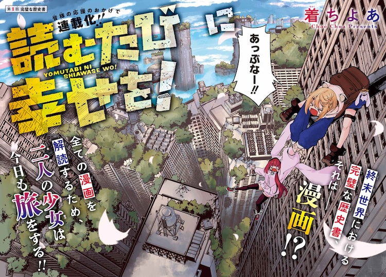 「読むたびに幸せを!」の舞台は文明が衰退した終末世界。“漫画”は文明の歴史書であると信じる少女・めくりと、漫画は信じていないが怪力ゆえに漫画みたいなことができてしまう少女・きよしが、終末世界に存在するすべての漫画を解読すべく旅をしていく。同誌に掲載された読み切りが好評を博し連載化に至った。