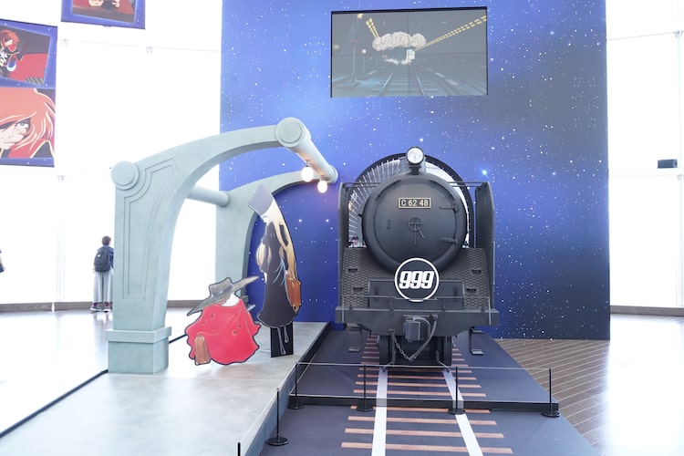 都内の景色を一望できる東京シティビューのエントランスには、「銀河鉄道999」に登場する駅のプラットフォームと、銀河超特急999号のモニュメントが登場。大型モニターには「銀河鉄道999」のアニメーション映像が映し出され、この先に展開される展示の数々への期待を煽る。そしてエントランスの先にある長い廊下には、松本作品の年表や“スター・システム”を解説したパネルが登場した。