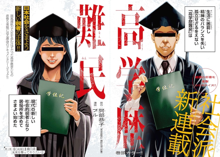 華やかな学歴で順風満帆な人生を歩むはずだったが…RED新連載「高学歴難民」 2025年6月19日2025年6月19日 editor 「高学歴難民」扉ページ阿部恭子原作によるブルの新連載「高学歴難民」が、本日6月19日発売の月刊チャンピオンRED8月号(秋田書店)で開幕した。 一流大学を卒業し、順風満帆な人生を歩むはずだった高学歴者。その中には華やかな学歴がかえって烙印となり“社会的弱者”となる人々がいた。高学歴者たちの実態に迫る、講談社の現代新書をコミカライズしたドキュメンタリーだ。また今号には「ニンジャスレイヤー キョート・ヘル・オン・アース」の付録「疾風、旋風、チョップな団扇」が封入されている。 関連記事虚弱体質の少年が戦国の世を生き抜く成長物語、なろう発コミカライズがREDで開幕「蒼の彼方のフォーリズム」10周年イベントを6月に開催 福圓美里、山本希望ら出演「蒼の彼方のフォーリズム」明日香たちを彩った、10周年イベントのキービジュアル「ラーメン大好き小泉さん」REDの出張掲載で富山ブラック啜る、付録に両面ファイル「風魔の小次郎 外伝 飛鳥無明帖」最新話がREDに 武蔵のカレンダーポスターも付属観劇にぴったり「絢爛たるグランドセーヌ」招待券風のチケットホルダーがRED付録に Tweet 関連コミック 高学歴難民