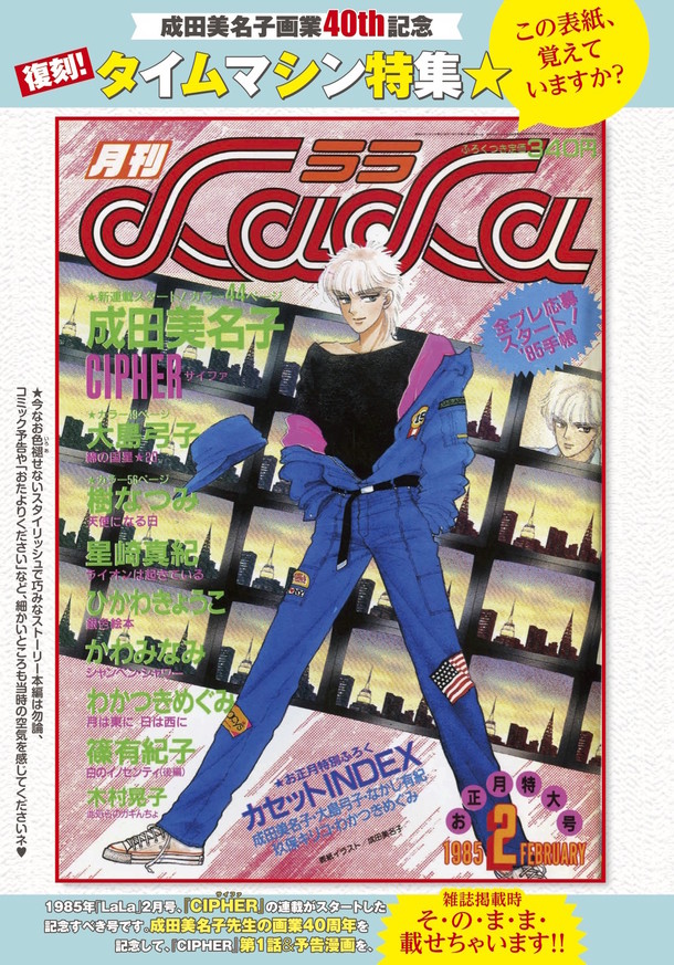「CIPHER」はニューヨークの芸術学校に通うアニスと、双子のサイファとシヴァを軸にした物語。今号にはLaLa1985年2月号(白泉社)に掲載された第1話、その前号にて発表された予告編が再録され、柱コーナーの広告や「新連載、ぐわんばりますだすっ!!」といった成田のコメントなども当時のまま再現された。またLaLa1985年2月号の表紙と巻頭カラーもお目見え。さらに「CIPHER」の復刻ポスターが付属している。