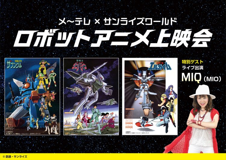 1970年代後半から1990年代にかけてサンライズ(現バンダイナムコフィルムワークス)制作のロボットアニメを放送していたメ~テレ。今回の上映イベントではメ~テレにて1982年から1985 年にかけて放送された「戦闘メカ ザブングル」「聖戦士ダンバイン」「重戦機エルガイム」の上映に加え、3作品の楽曲に参加したMIQ(当時MIO)のミニライブも実施される。各作品の上映話数は特設サイトで実施されるアンケート結果で決定。7月31日23時59分まで1日1回投票ができ、各作品から選ばれた1話ずつが上映される。なおイベントは11時の回、15時30分の回の2回が予定されている。