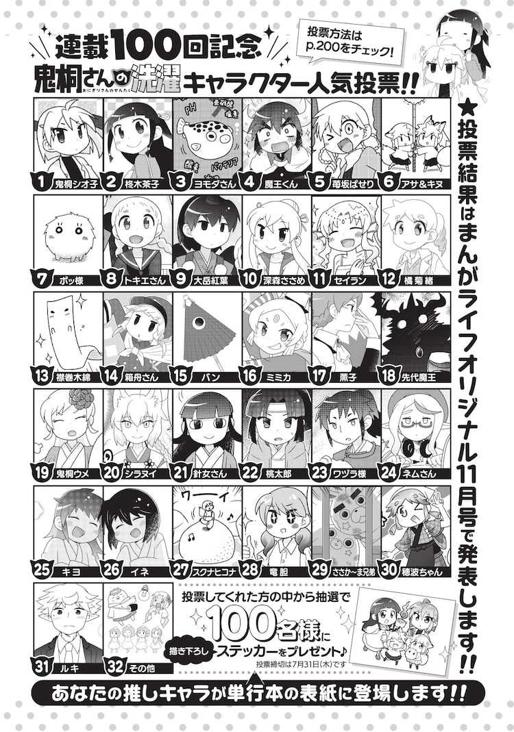 ふかさくえみ「鬼桐さんの洗濯」が連載100回に到達。これを記念して、本日7月11日発売のまんがライフオリジナル8月号(竹書房)ではキャラクター人気投票が開催されている。